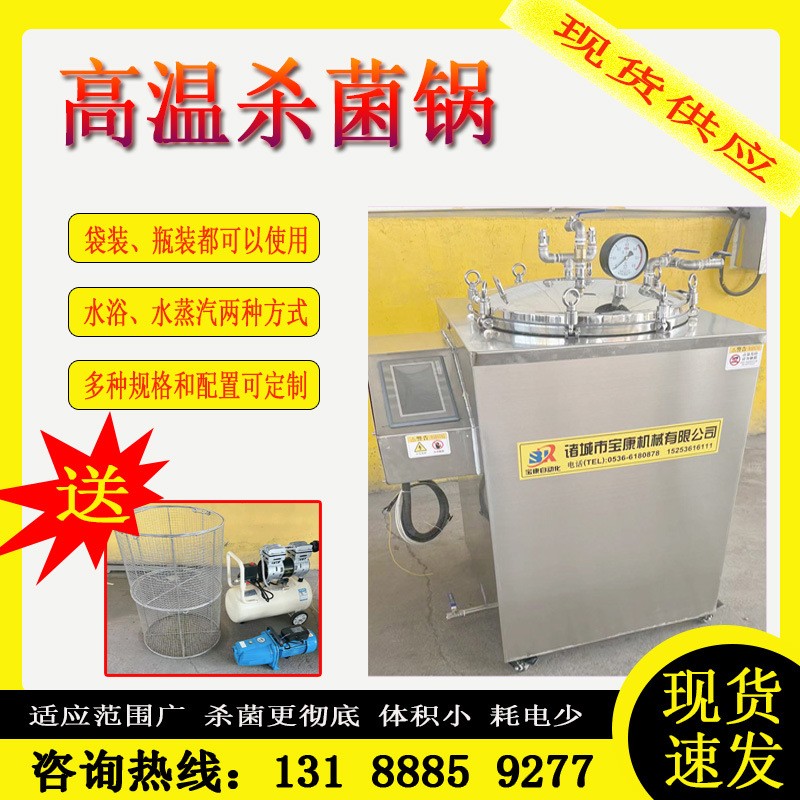 小型立式殺菌鍋主要由鍋體·鍋蓋·開啟裝置·聯(lián)鎖裝置·軌道·滅菌筐·真氣噴灌及若干管口組成。鍋蓋密封采用充氣式硅橡膠耐溫密封圈,密封可靠,使用壽命長。具有受熱面積大,熱效率高,加熱均勻,液料沸騰時間短,加熱溫度容易控制的個特點(diǎn)。