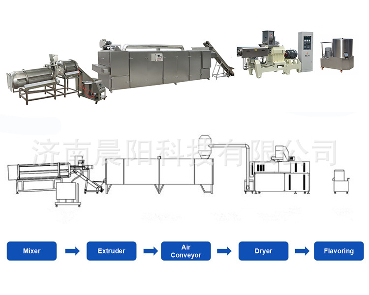 濟南晨陽科技有限公司是一家休閑膨化食品機械專業制造商。膨化休閑小食品是一種脆性食品,口感滑潤,谷物味香濃。隨著國民生活水平的提高和生活方式的改變,各種谷物膨化食品作為一種方便快捷、營養豐富的休閑零食很快進入千家萬戶。該休閑食品生產線具有可選機型多、設備配置靈活、原料范圍廣泛、產品種類多、操作簡單等特點。通過變換不同模具和改變生產工藝可生產市場上流行的各種膨化食品,適合于各類食品廠家。