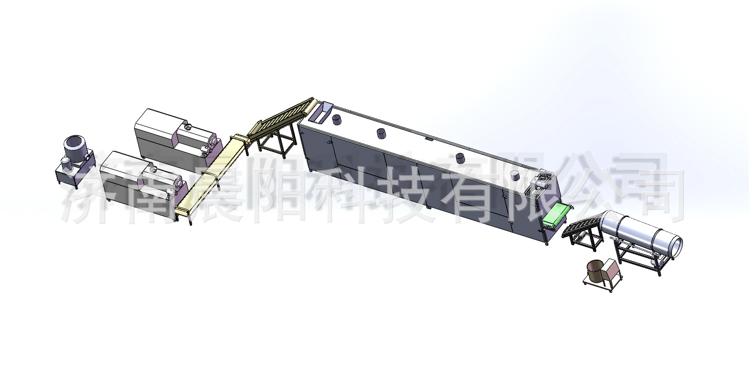 二. 休閑食品生產線設備配置: 拌粉機→螺旋上料機→雙螺桿膨化機→風送機→ 多層烤箱→提升機→噴油機→雙滾筒調味機/八角筒調味機→(包裝機)