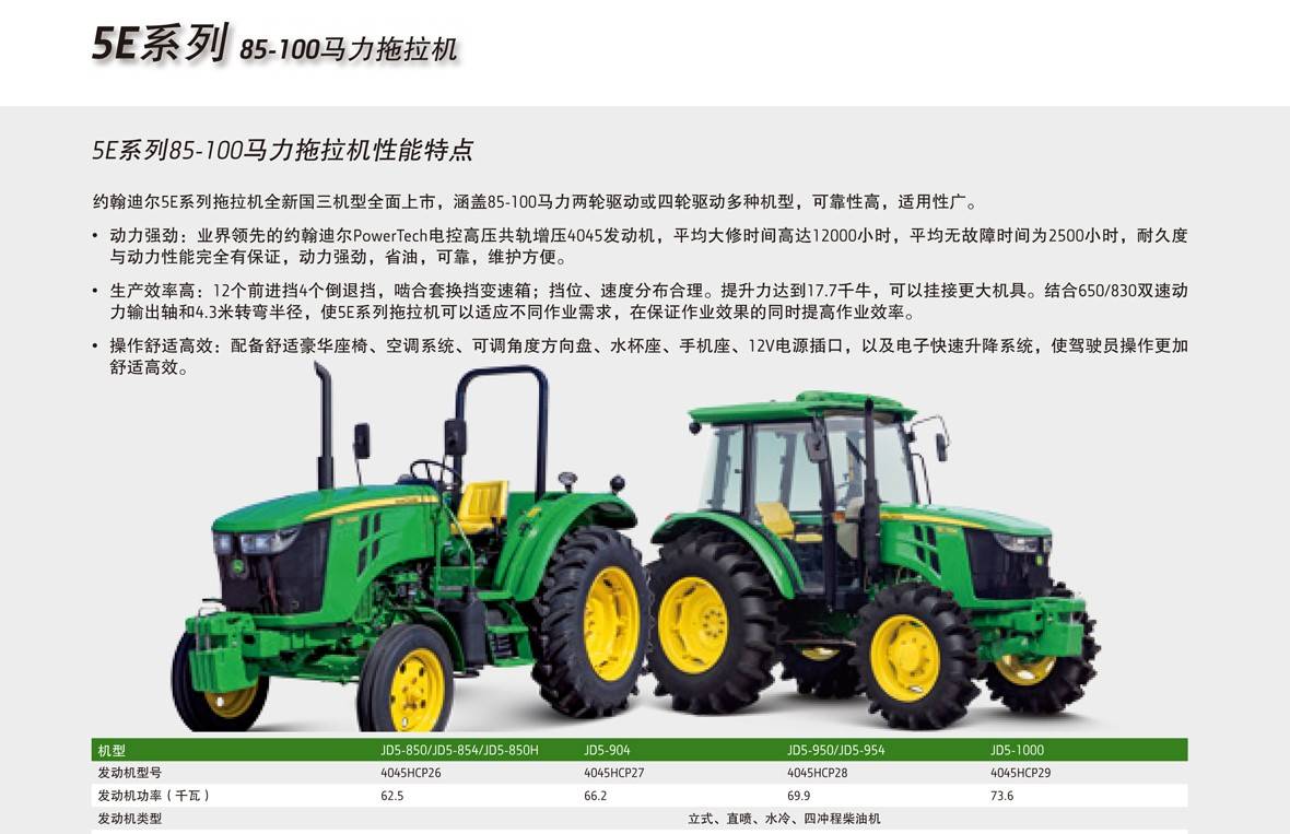 約翰迪爾5E系列拖拉機全新國三機型全面上市,涵蓋85-100馬力兩輪驅(qū)動或四輪驅(qū)動多種機型,可靠性高,實用性廣。拖拉機變速箱為嚙合套換擋,主副雙變速桿,12個前進(jìn)擋,4個倒退擋,操縱省力方便;采用靜液壓剎車系統(tǒng),制動效果極佳;獨立式主副離合器,設(shè)有變速桿空擋啟動開關(guān),只有變速手柄在空擋或停車擋上,發(fā)動機才能啟動;配置德納四輪驅(qū)動前橋,承載能力強,可靠性高;液壓轉(zhuǎn)向系統(tǒng),操縱輕便,最小轉(zhuǎn)彎半徑4.3米;強制潤滑系統(tǒng),延長使用壽命;迪爾技術(shù)制造的核心部件,可靠耐用;離合器片采用粉末冶金材料,抗磨耐用。