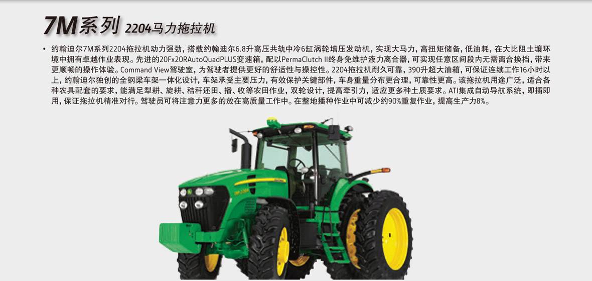 產品引進約翰迪爾公司成熟的7M系列技術,嚴格按照約翰迪爾產品開發程序(EPDP)開發制造。生產中嚴格執行約翰迪爾質量生產體系(JD-QPS),質量可靠。搭載約翰迪爾6.8升高壓共軌中冷6缸渦輪增壓發動機,動力強勁,扭矩儲備高。