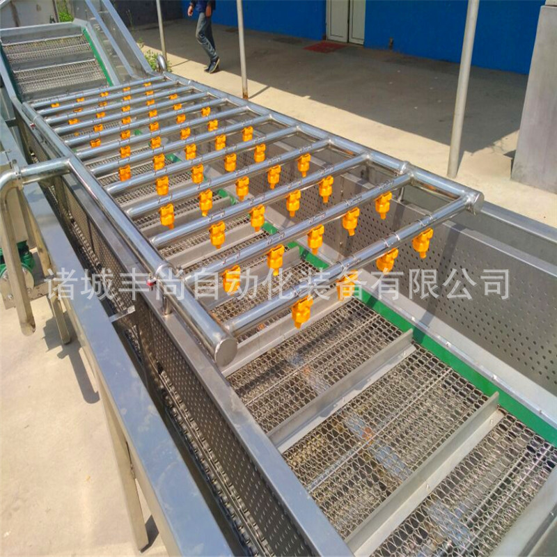 首先需要清洗的蔬菜全部放入水槽,在高壓水流和強力氣泡的作用下,被充分打散、翻滾、清洗、傳送。蔬菜表面的泥沙會脫落,網帶清洗機沉淀到底部隔離倉,防止翻揚回流造成再度污染。從而蔬菜上洗落下來的雜物和小蟲會漂浮在水面,然后被網孔收集,溢出水槽的水流被排除水箱,進入尼龍袋中。蔬菜被蔬菜清洗機洗干凈后,再經過噴淋的清洗,網帶清洗機然后通過輸送帶送出,傳送帶末端有一個吹起裝置,沒有被徹底清理掉的雜物被吹掉。