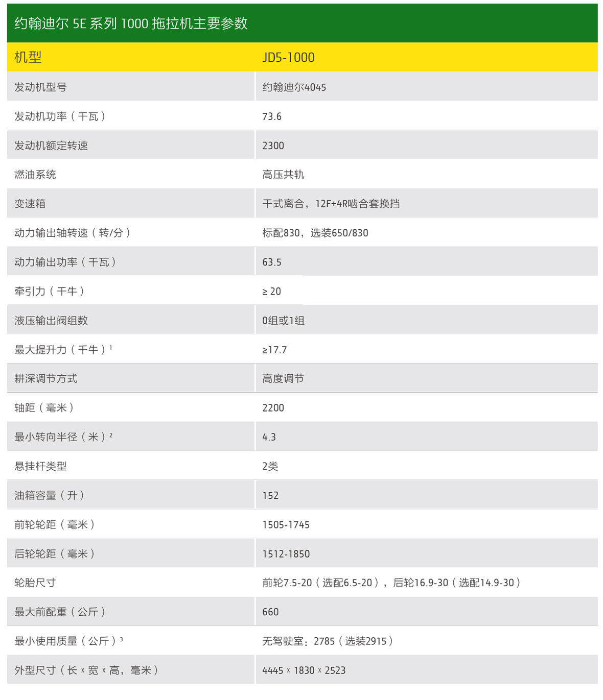 約翰迪爾5E系列1000拖拉機主要面向中京地區的廣大用戶,配合旋耕機或旋播機使用。該機配備約翰迪爾PowerTech4.5升電控高壓共軌發動機,可靠性和耐久性高。針對中原地區的中小地塊,該機具有4.3米的轉彎半徑和152升的超大油箱,可顯若高生產效率。其主、副變速區構成12個前進擋和4個倒擋,可實現的速變范圍廣擁有各種農田作業、運輸所需的理想工作速度,有利于提高燃油經濟性。標配強壓提升器,可限制農具入土深度,操作簡單方便。約翰迪爾5E系列1000拖拉機以其強大的動力、完善的功能,大氣的外觀和安全保證、舒適的使用體驗和使捷的維修保養,可全方位滿足用戶的多種需求。約翰迪爾5E系列1000拖拉機必將給用戶帶來的良好的耕作體驗和更多收益。