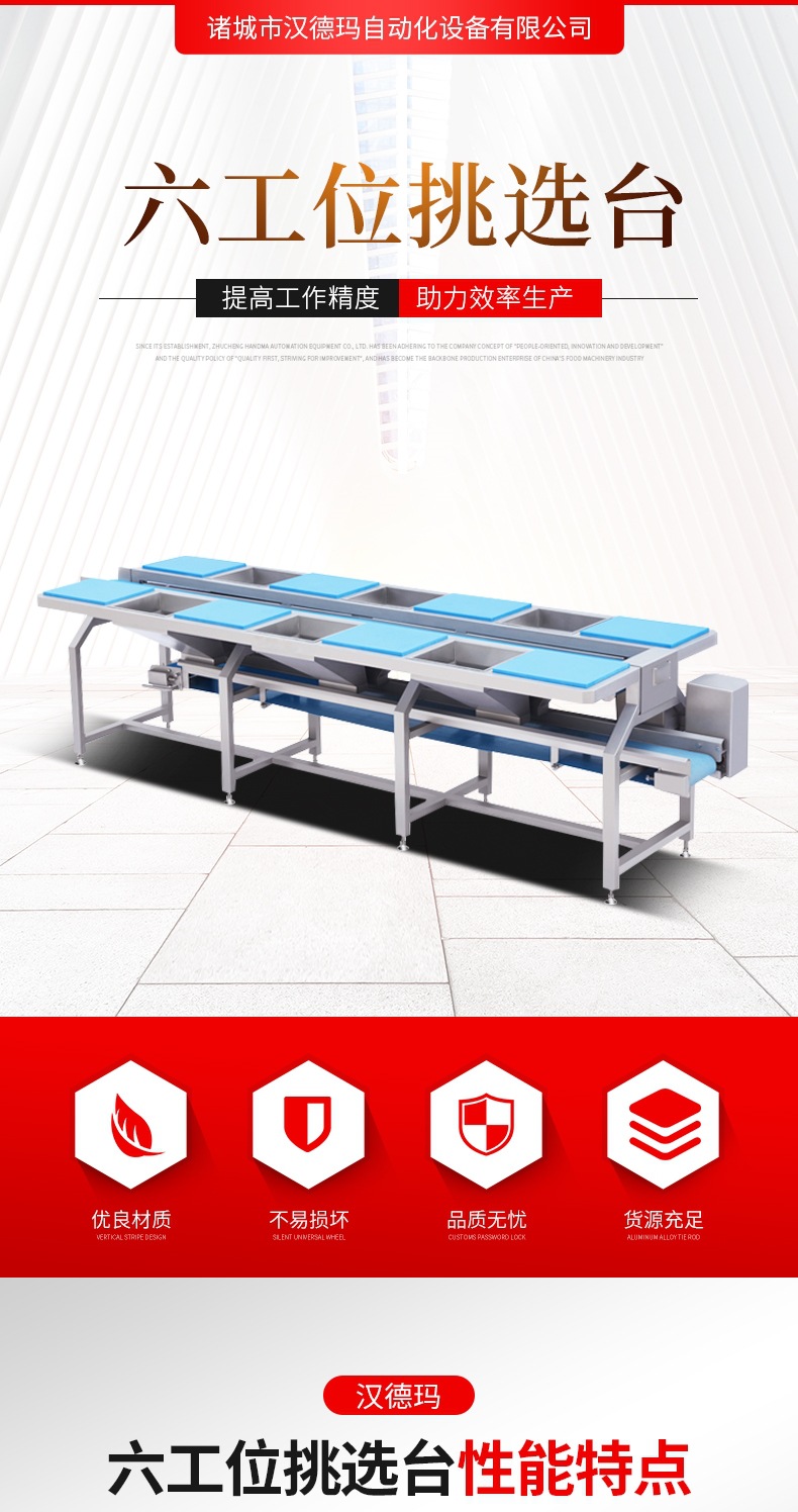 詳細信息 訂貨號1 加工定制是 貨號六工位挑選臺 類型帶式輸送機 品牌漢德瑪 型號六工位挑選臺 輸送能力200(t/h) 功率0.75(KW) 輸送距離咨詢(m) 外形尺寸2685×1020×895mm(m) 重量咨詢(kg) 適用領(lǐng)域蔬菜、水果、餐廳、酒店挑揀輸送機 是否跨境出口專供貨源否
