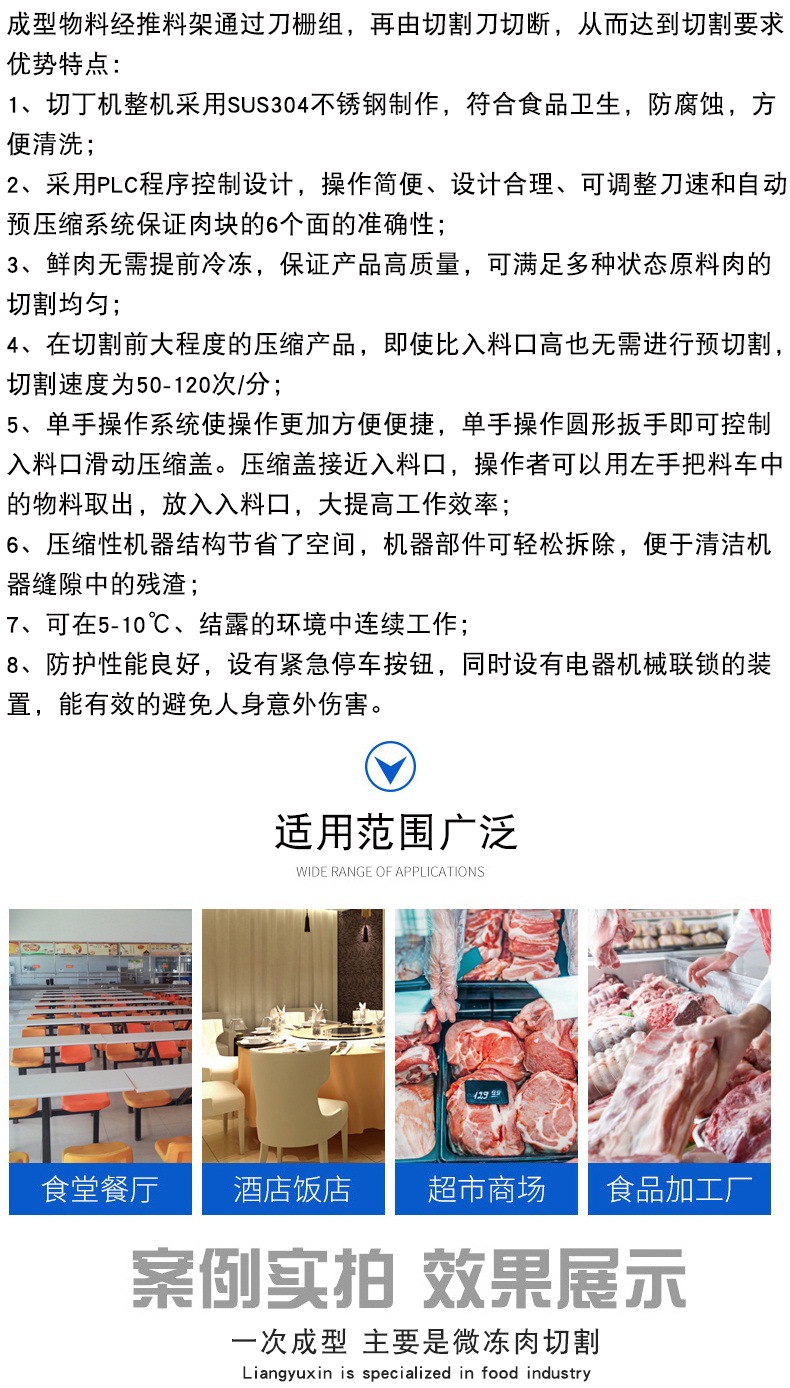 雞鴨肉牛肉筋羊豬肉大型全自動切丁切條切片機。 該切丁機能精確切割到最小3mm,最大27mm,可切割不同的“片、塊、丁、條”等,是食品廠加工切、割方面的首選設備。切丁機是借鑒國內外先進的機械設計理念,并結合我公司現有產品生產工藝要求自行研發設計的。在同類產品中具有穩定性高、操作方便、產量大、能耗低等特點。該機能切割-1℃-20℃微凍肉、生鮮肉、熟肉、部分果實、蔬菜、海鮮及無骨禽類產品。