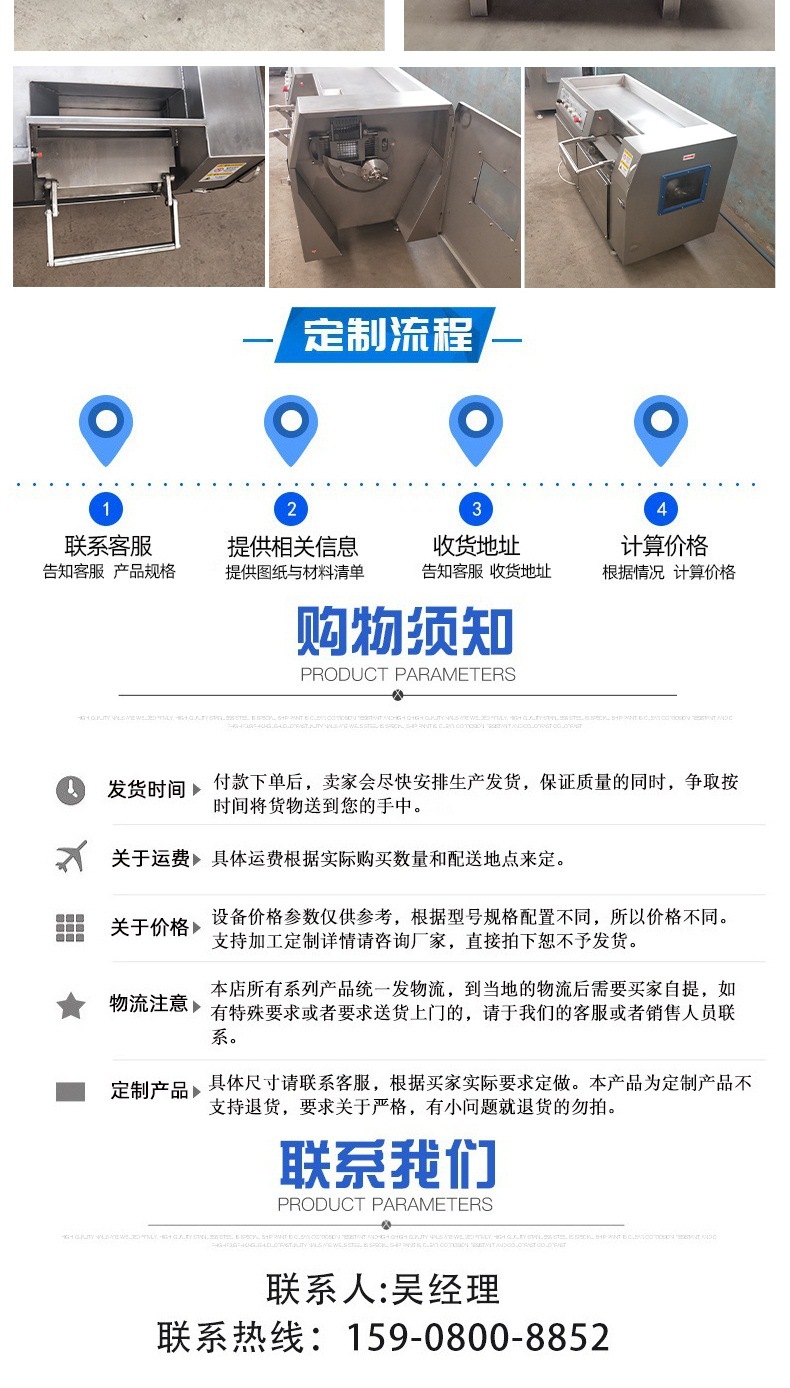 雞鴨肉牛肉筋羊豬肉大型全自動(dòng)切丁切條切片機(jī)。 該切丁機(jī)能精確切割到最小3mm,最大30mm,可切割不同的“片、塊、丁、條”等,是食品廠加工切、割方面的首選設(shè)備。切丁機(jī)是借鑒國(guó)內(nèi)外先進(jìn)的機(jī)械設(shè)計(jì)理念,并結(jié)合我公司現(xiàn)有產(chǎn)品生產(chǎn)工藝要求自行研發(fā)設(shè)計(jì)的。在同類產(chǎn)品中具有穩(wěn)定性高、操作方便、產(chǎn)量大、能耗低等特點(diǎn)。該機(jī)能切割-1℃-20℃微凍肉、生鮮肉、熟肉、部分果實(shí)、蔬菜、海鮮及無(wú)骨禽類產(chǎn)品。