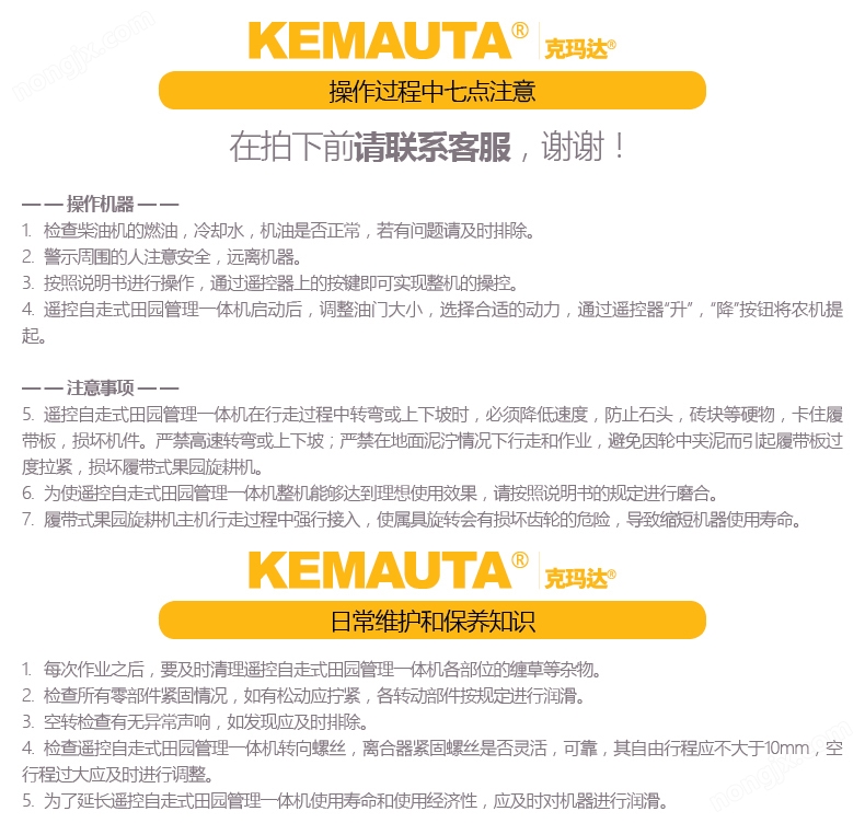 可遙控旋耕開溝施肥田園管理機KGYL588-3實現智能遙控操作,可實現轉向、停止與行走、機具升降功能,適合果園和大棚作業時空間受限和對人身有危害的特殊環境作業;整機尺寸緊湊,產品體積小,樹叢間通過性能好,操作靈活;采用履帶式行走設計,坡地、坑洼地通過性能強,抓地能力強、牽引力大;采用6+2低速變速箱(帶高低速),性能穩定、操作方便、可滿足不同作業環境及佩戴機具的作業需求。