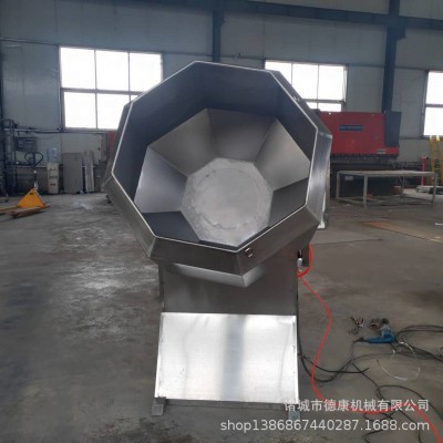 采用減速電機,齒輪傳動,使油炸的食品不破碎,自動攪拌、拌料均勻、操作方便、產量高、不銹鋼制作、滾桶的轉速和傾斜度都可以調節、給粉量也可以控制、可以對食品進行調味、拌料。根據油炸食品的形狀特點設計制造的,是油炸食品調味、拌料設備,八角拌料機結構簡單實用,主要用于食品的后期調味粉的攪拌或原料的裹粉包衣以及摻和,桶體為不銹鋼八角型設計,避免了圓球拌料桶原料不翻動,拌料不均勻的弊端,能在較短時間內使待加工食品物料與所需調料充分拌合均勻,自動傾斜把食品物料送出筒外。達到自動拌勻,自動出料,清理消毒方便無死角。
