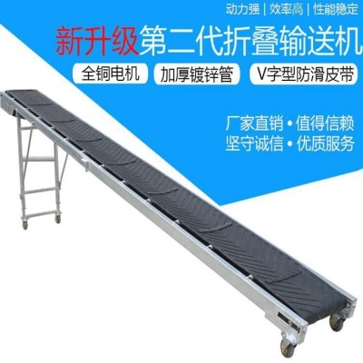 手搖升降皮帶輸送機 裝車卸貨輸送帶/移動式皮帶輸送機包括機架、皮帶、脫軌。機座、支架,三者呈三角形;機架上設有輸送帶;所述機架一端接觸地面,另一端遠離地面;所述機座位于地面,具有行走輪;所述機架遠離地面的一端下方設有高度調節裝置,所述支架通過所述高度調節裝置與所述機架相連。本實用新型通過高度調節裝置,機架的一端高度可以調節,可適用于不同車型的車箱,還可以將機架的一端通過高度調節裝置的調節伸入車廂內,避免下雨天對裝車工作的影響。