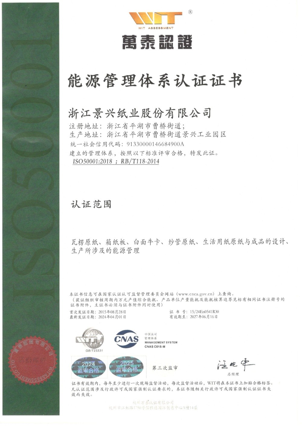 景興紙業(yè)于1996年率先在同行業(yè)通過ISO9001質(zhì)量管理體系認證,2002年通過ISO14001環(huán)境管理體系認證,2014年通過OHSAS18001職業(yè)健康安全管理體系認證,2015年通過GB/T23331能源管理體系和FSC?森林體系認證,2018年通過兩化融合管理體系認證。