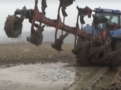 國外拖拉機(jī)在泥水中搶翻玉米地